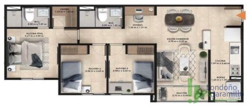 Apartamento en Venta Rionegro Rionegro Apartamento, de 56 m2, Cuenta con 2 habitaciones una con vestier, un closet, 2 baños, salón-comedor, balcón, co