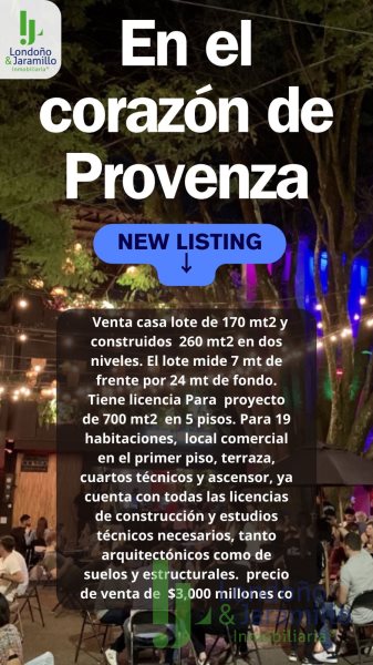 Casa en Venta Provenza Medellin Venta casa lote de 170 m2 y construidos 260 m2 en dos niveles. El lote mide 7 mt de frente por 24 mt de fondo. Tiene l